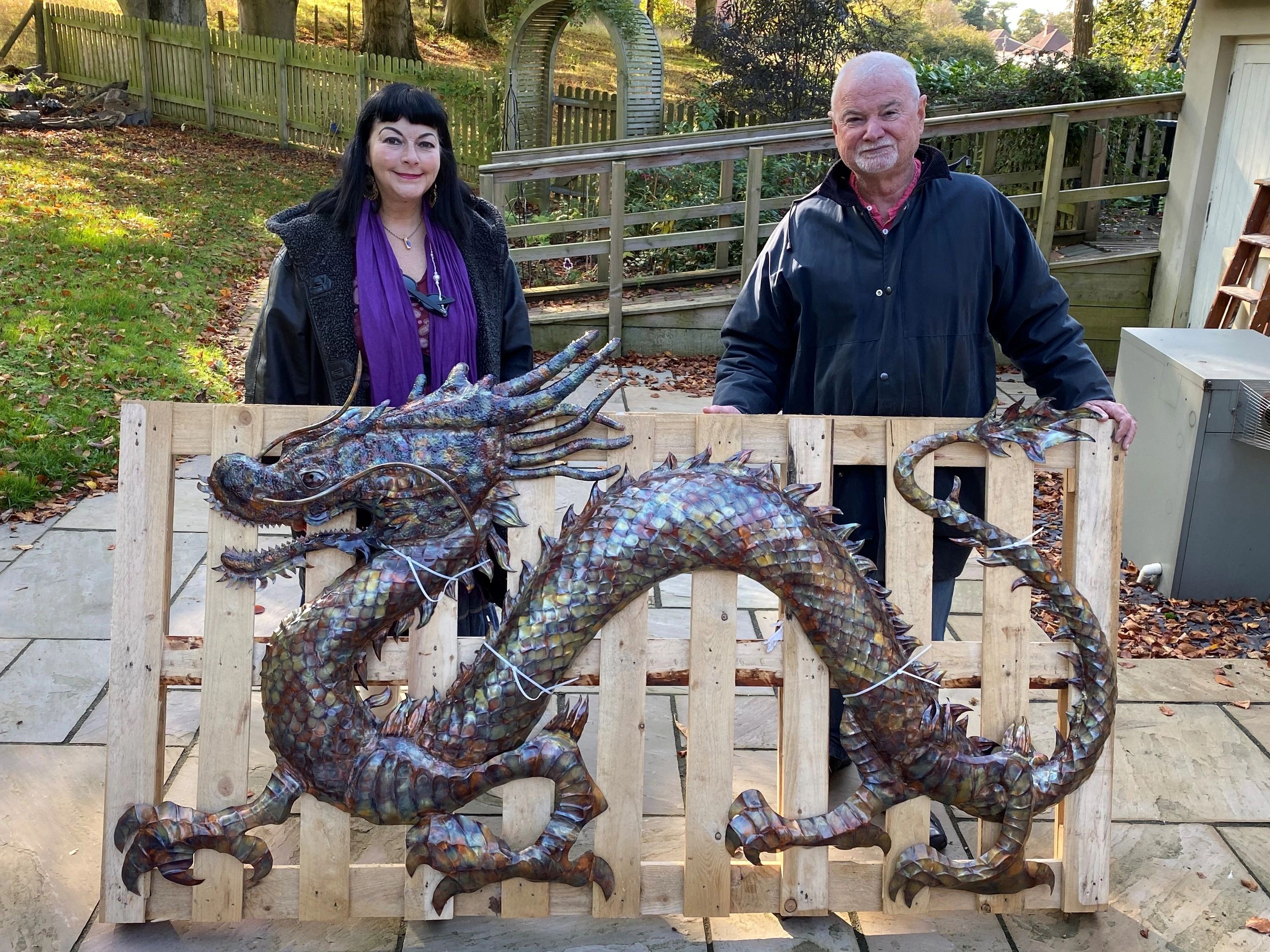 The scales are all individually hand hammered with tooling I made specifically for this project and it is flame coloured and lacquered to prevent any loss of colour even in bright sunlight. Alongside its smaller version it will look spectacular in the sunshine of Greece.
